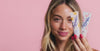 Model holding a Lanolips yellow phone lip holder with a yellow holder featuring the Lanolips Sun Balm SPF 30 Tropical Lip Balm against their face.